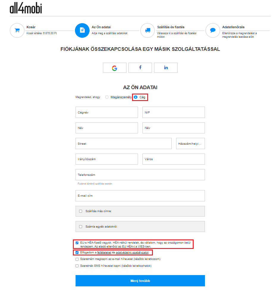 Az All4mobi S.A. webáruházat egy varsói székhelyű lengyel vállalat üzemelteti. Ha Ön nem lengyelországi áfaalany, akkor a vásárlásához szükséges az áfa összegének csökkentése. Az adatok megadásakor mindössze annyit kell tennie, hogy elolvassa és elfogadja a felhasználási feltételeket és az adatvédelmi szabályzatot, valamint bejelölje a következő négyzeteket: