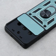 Telefontok a Realme 11 Pro 5G / 11 Pro+ 5G, CamShield Slide, zöld tok állvánnyal és mágneses ujjmarkolattal. A tok kiváló minőségű anyagokból készült, teljesen funkcionális és szilárd védelmet nyújt a készüléknek. A tok műanyagból és rugalmas, edzett TPU gumiból készült. A hátlapon praktikus fém ujjfogantyú található, amely autós mágnestartó rögzítésére használható. A tok megerősített sarkokkal és élekkel rendelkezik, és megbízhatóan védi a telefont a sérülésektől. Egy kiegészítő keret védi az okostelefon oldalait és sarkait, és hatékonyan szigeteli a képernyőt azoktól a felületektől, amelyeken fekszik. A tok illeszkedik a készülék adott modelljéhez, rendelkezik a szükséges kivágásokkal és gombokkal, és teljesen működőképes.