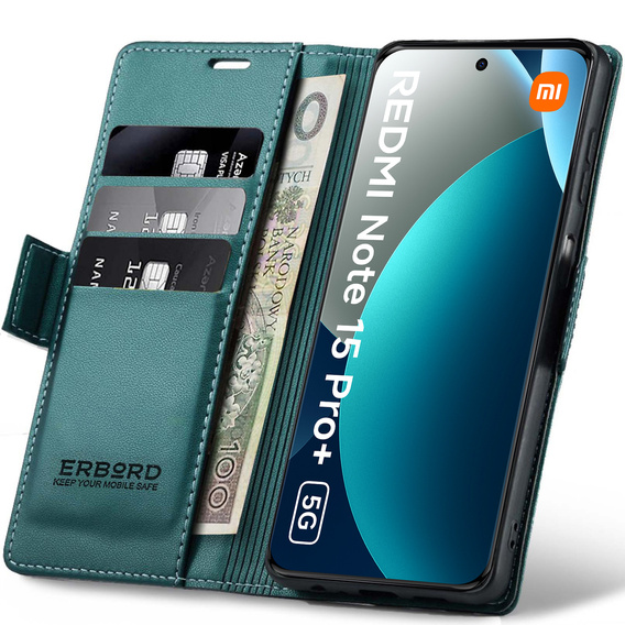 - 1 × ERBORD Glossy Litchi flip pénztárca tok Xiaomi Redmi Note 15 Pro Plus 5G / Poco M8 Pro 5G készülékhez – zöld